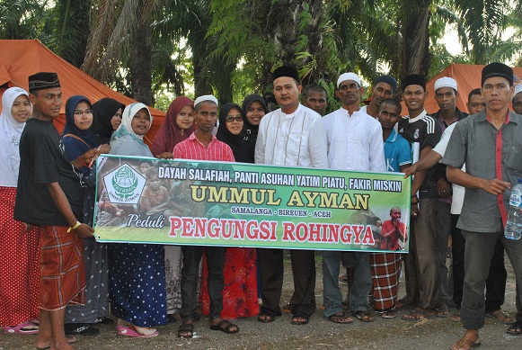 Langsa – Para guru Dayah Salafiah Ummul Ayman menyerahkan bantuan kepada pengungsi Rohingya di dua tempat penampungan, di Desa Bayern Kecamatan