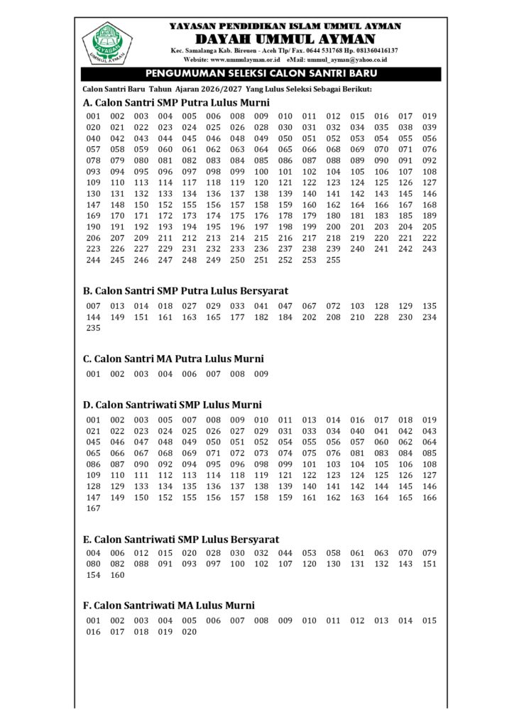 Dayah Ummul Ayman dengan resmi mengumumkan hasil seleksi Penerimaan Santri Baru Tahun Ajaran 2026/2027. Proses pendaftaran telah berlangsung setiap hari Sabtu dan Minggu selama bulan Januari, dengan tahapan seleksi meliputi ujian tulis, ujian lisan, dan wawancara.