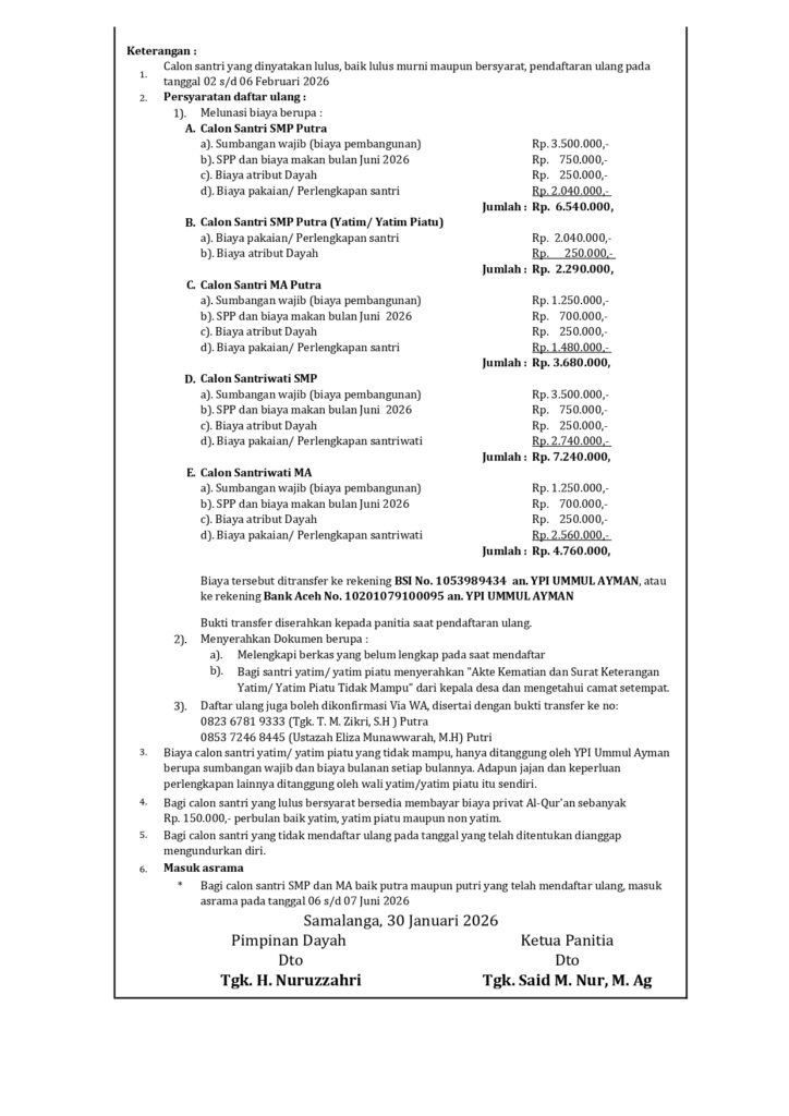 Calon santri yang dinyatakan lulus diwajibkan melakukan pendaftaran ulang pada tanggal 02 s/d 06 Februari 2026dengan melengkapi seluruh persyaratan sebagaimana tercantum dalam pengumuman Penerimaan Santri Baru. Calon santri yang tidak melakukan pendaftaran ulang hingga batas waktu yang telah ditentukan dianggap mengundurkan diri.